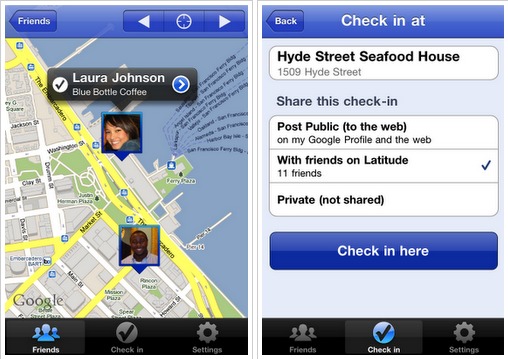 Google Latitude, the app that lets you see your friend’s locations on a Google map and share where you are, has added check-ins to the iPhone. (Check-ins were previously available on the Android) Now your friends will know that you are at that Irish Pub as opposed to just somewhere on the corner of Walnut and Main.